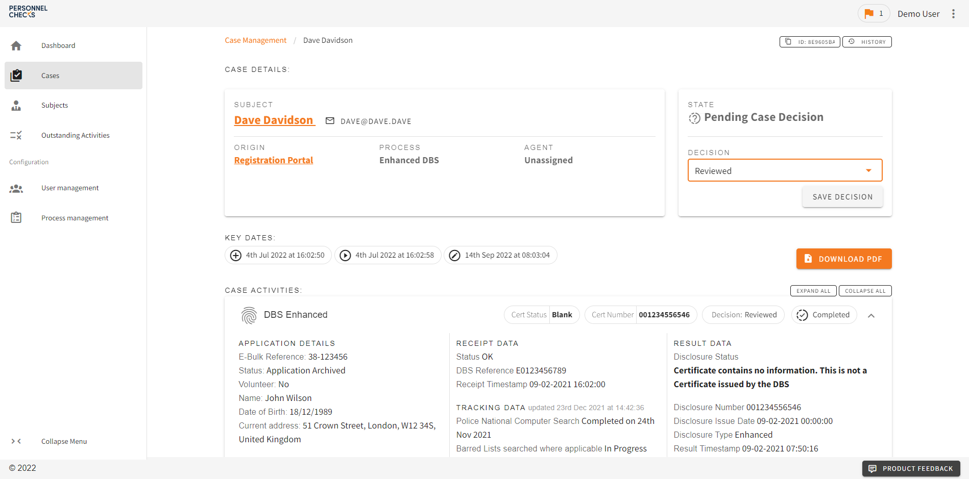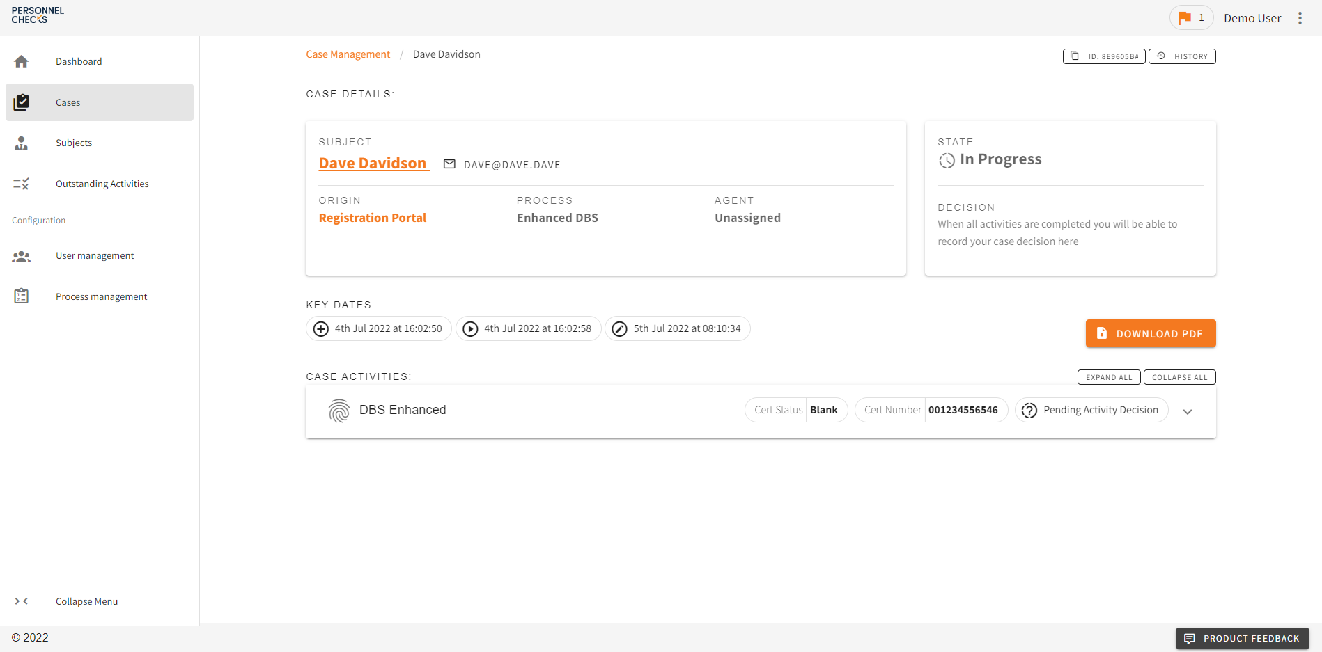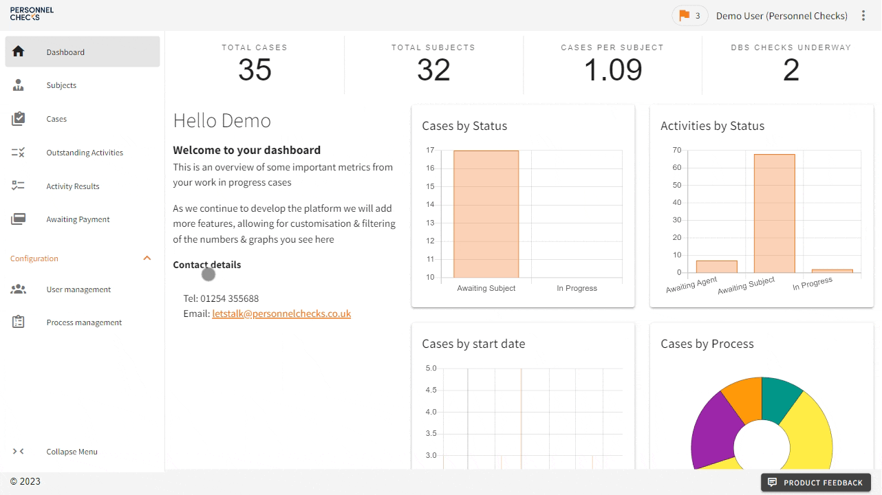 From your Cases screen, click the Add Case button in the top right corner. From here you can complete some basic details, firstly creating the subject, then selecting the process. Finally, create the case by clicking confirm. This then sends an email to the Subject.