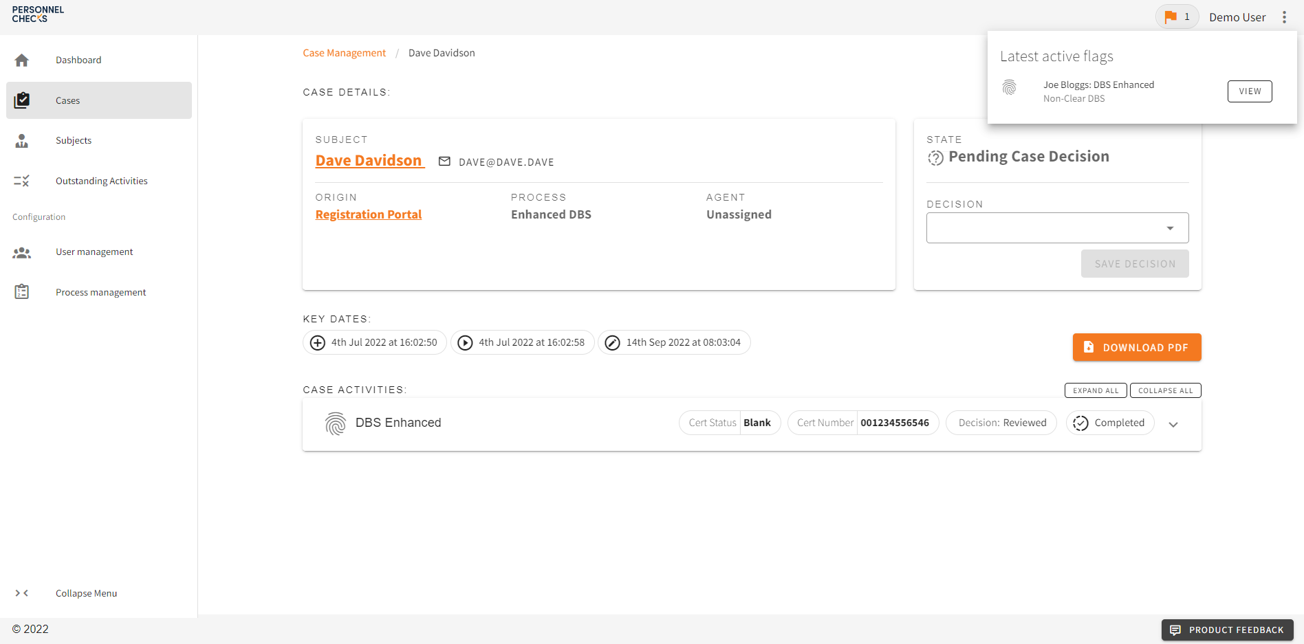 Should a DBS come back with content, you will be notified with a Flag. Flags are a request for attention, and do not always mean bad news. For example, let’s say Joe completed a DBS, but there is information on the certificate. His Case Activity screen will look like this: